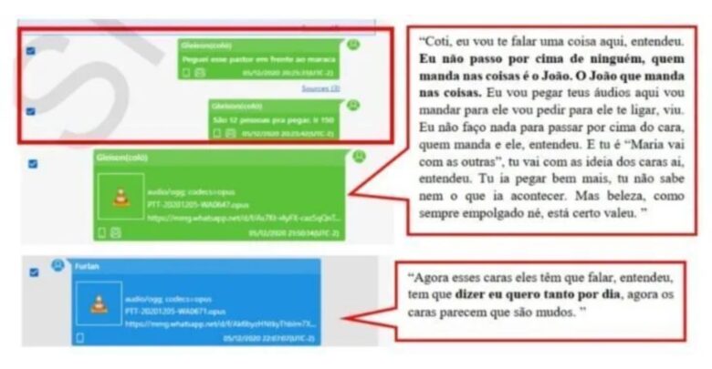 De acordo com a Polícia Federal, as conversas indicam participação direta de João Furlan e de Dr. Furlan no esquema. Há registros de pedidos de transferências bancárias, orientações para entrega de valores em dinheiro e ao menos 50 comprovantes de transferências feitas pelo promotor ao motorista, com quantias que variam de R$ 20 a R$ 3 mil.