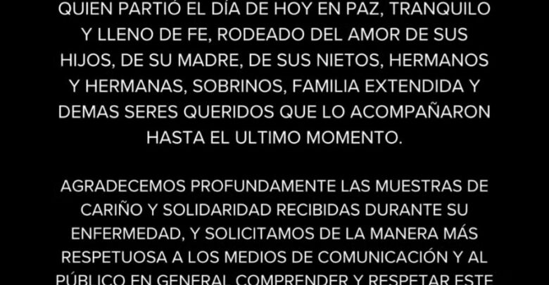 “Com profundo pesar, a família Torres Castilla compartilha a notícia do falecimento do querido Pedro Torres Castilla, que partiu hoje em paz, tranquilo e cheio de fé”, diz o texto.